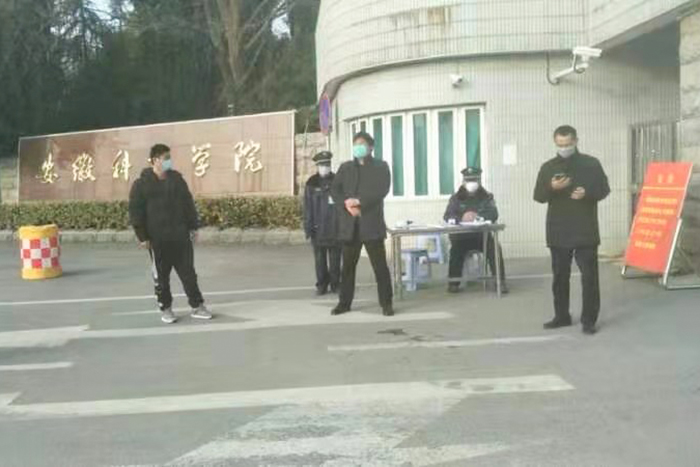 强化校园管控。坚持24小时值班值守,保卫干部职工连续多日奋战在工作一线,从严从细抓落实,严格执行校园封闭式防控要求,依法依规开展大门管控和体温检测工作,禁止外来人员和车辆进入校园,制作发放教职工家庭采购物资出入证,严格证件核查限时进出校园,对进入校园人员做好登记逢人必检,坚决阻断潜在传染源。在做好校门管控的同时,积极宣传防疫安全知识,不厌其烦地提醒教职工“戴口罩、少出入。”