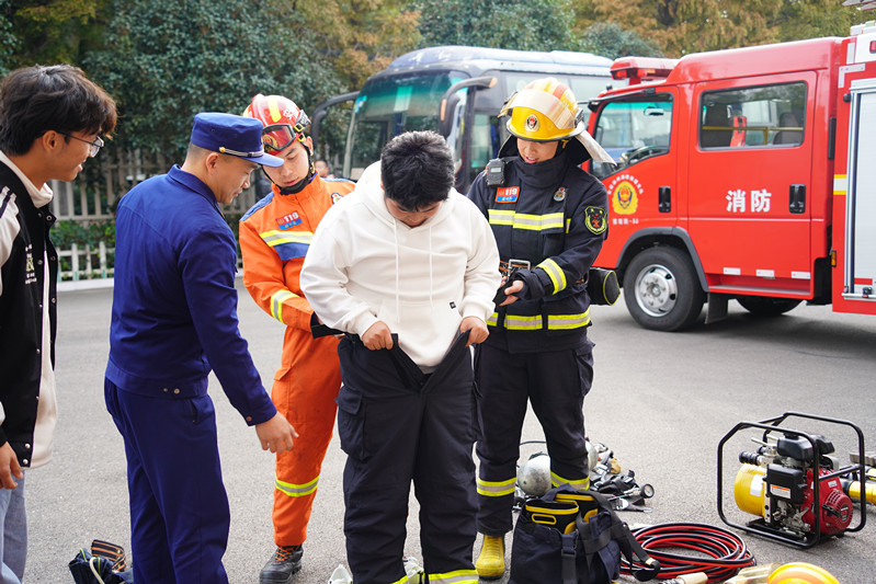活动伊始,消防救援站站长谢伟带领同学们参观了消防救援站的消防设施和装备,并邀请大家亲身体验消防器材的使用和救援服穿戴。随后,同学们观摩了高楼救援和水带连接等训练项目。看到消防救援人员沉着冷静、熟练地运用各种设备进行救援,同学们由衷表示敬佩。最后,同学们还参观了消防队训练场、“龙虎榜”、营房、健身房、娱乐区等。