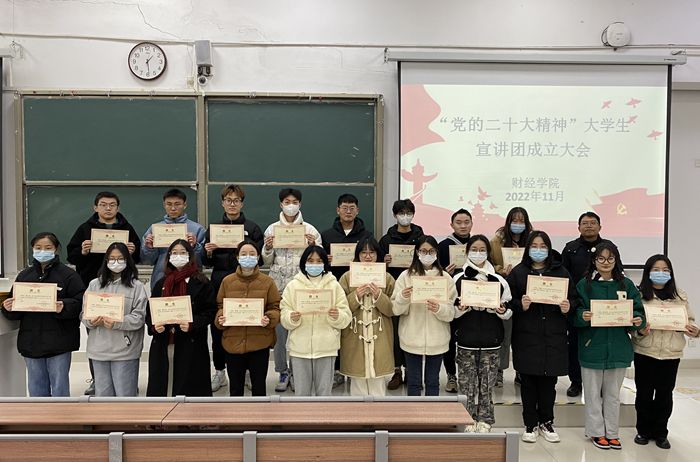 为深入学习贯彻党的二十大精神,有效推动学习活动走深走实,财经学院于2022年11月成立党的二十大精神大学生宣讲团。
