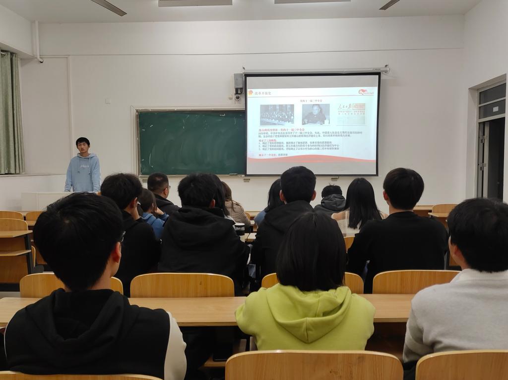 会议开始,汪世豪带领同学们回顾了中国的改革开放史,通过图片与文字结合的方式,多维度立体地诠释了新中国“因图强而生,因改革而兴”的发展脉络;随后以视频的形式,生动地展示了党中央制定改革开放政策后中国创造的各项成就,让青年团员深入了解中国改革开放和社会主义现代化建设的伟大成就,深刻了解党带领人民走过的艰辛历程。