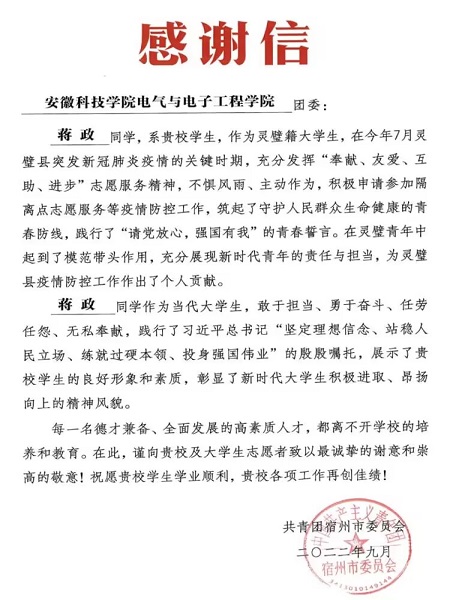 10月12日上午,共青团财神在线登录官网电气与电子工程学院委员会收到一封来自共青团宿州市委员会的感谢信。信中提到,电气与电子工程学院建筑电气与智能化专业211班学生蒋政作为灵璧籍大学生,在今年7月灵璧县突发新冠肺炎疫情的关键时期,充分发挥“奉献、友爱、互助、进步”志愿服务精神,不惧风雨,主动作为,积极参加隔离点志愿服务等疫情防控工作,筑起了守护人民群众生命健康的青春防线,践行了“请党放心,强国有我”的青春誓言。