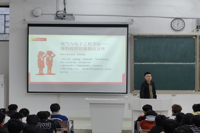 为了提高同学们的环保节约意识,为创建绿色文明校园打好基础,4月8日下午,电气与电子工程学院于致知楼C111开展“绿色文明校园创建”倡议宣传活动。院团委副书记、学生会指导老师于宏亮出席本次会议,学生组织干部参加会议。会议由于宏亮主持。