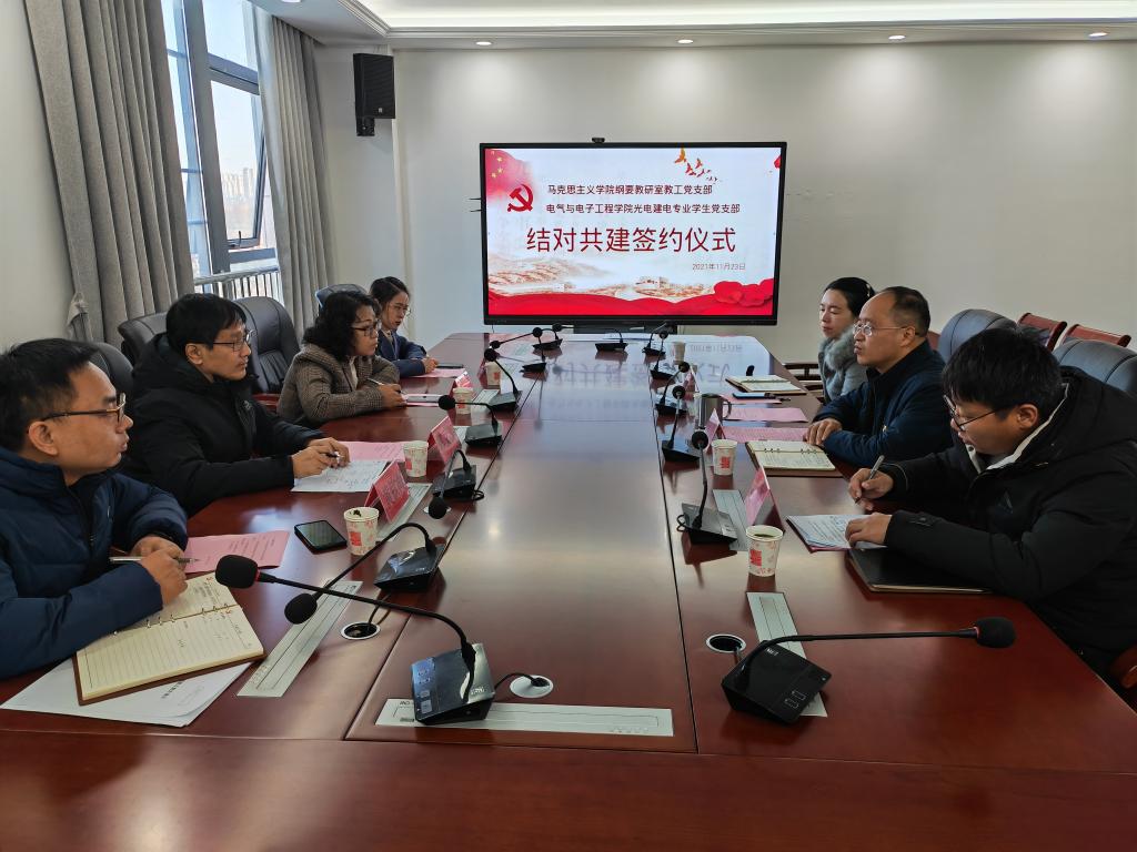 11月23日上午,马克思主义学院纲要教研室教工党支部与电气与电子工程学院光电建电专业学生党支部开展结对共建签约活动。电气与电子工程学院党委副书记、纪委书记尚磊,党政办公室主任王延丽,马克思主义学院纲要教研室教工党支部书记郭文深,宣传委员、纲要教研室主任李红艳,纪检委员黄钦海,教工党员戴婧佼以及光电建电专业学生党支部学生党员代表出席了结对共建签约活动。活动由光电建电专业学生党支部书记张深主持。