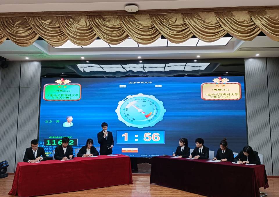 决赛共分为立论陈词、质询、自由辩论、总结陈词四部分。比赛过程中,正反双方围绕“宽松式管理利大于弊/弊大于利”展开了精彩的比赛。比赛中,各辩手你来我往,唇枪舌战,用良好的风范、出色的口才、敏捷的思维,使场下观众为之折服,掌声不断。最终,反方电子信息工程212班凭借着出色的反应能力和严谨的逻辑夺得本届辩论赛冠军。