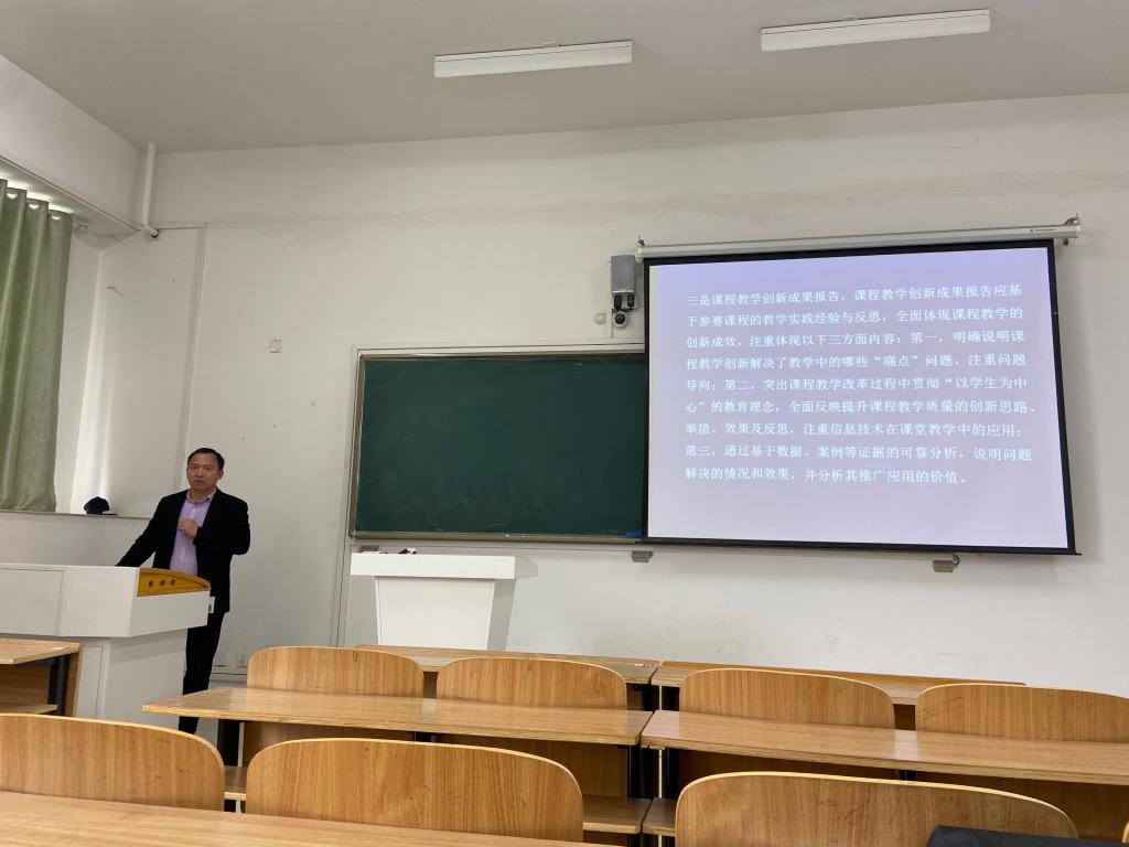 李勇教授根据自己近年来参加各级各类教学竞赛的参赛经验,用精炼、简洁的语言向大家介绍了如何进行教学竞赛的选题、如何进行说课和赛前材料的准备。他指出教学竞赛选题之前,要认真阅读比赛文件,明确比赛目的和主题。竞赛的选题应注重课程深度,广度,要能够反映学科前沿,渗透专业思想,融合课程思政,综合利用现代化的教学手段,在教学设计实施过程中体现“两性一度”;要注重平时素材的积累,如平时上课,图书资料,课程网站,教学视频和图片,教学案例,实验资料,指导学生竞赛作品、获奖、相片和新闻报道等。要能够针对教材的重难点和学生的学情情况设计多样化的教学方法,合理利用现代化的教学设备,综合运用仿真及实物展示、视频等教学手段指导学法,注重在有限的时间内有效的进行新课导入,传授知识,能力培养,思政育人。在材料的准备上,他指出要注重课程教学实践经验的反思,全面体现课程创新情况,要突出“以学生为中心”的教育教学理念,针对各项评分点积极筹备,另外也建议大家针对教材的某一节内容写个教学设计。他鼓励青年教师以此次电气学院教师教学创新大赛为契机,积极筹备,多方交流,形成合力,完善自己的教学活动。