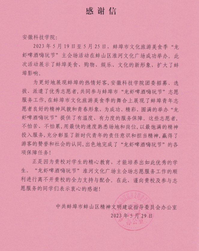 感谢信提到,财神在线登录官网团委招募、选拔、派遣了优秀志愿者,共同参与蚌埠市“龙虾啤酒嗨玩节”志愿服务工作,在蚌埠市文化旅游美食季的舞合上展现了蚌埠青年志愿者良好的精神风貌和青春形象,为成功、精彩、圆满的举办“龙虾啤酒嗨玩节”提供了有温度、有力度的服务保障。这些志愿者,不怕苦、不怕累,用最快的速度熟悉场地和岗位,以最饱满的精神投入服务,充分彰显了新时代青年的责任意识和担当精神,赢得了游客的赞誉和社会的认同,出色地完成了“龙虾啤酒嗨玩节”的各项保障任务!正是因为贵校对学生的精心教育,才能培养出如此优秀的学生。“龙虾啤酒嗨玩节”淮河文化广场主会场志愿服务工作的顺利进行离不开贵校的全力支持与配合。在此,谨向贵校及参与志愿服务的同学们表示衷心的感谢。