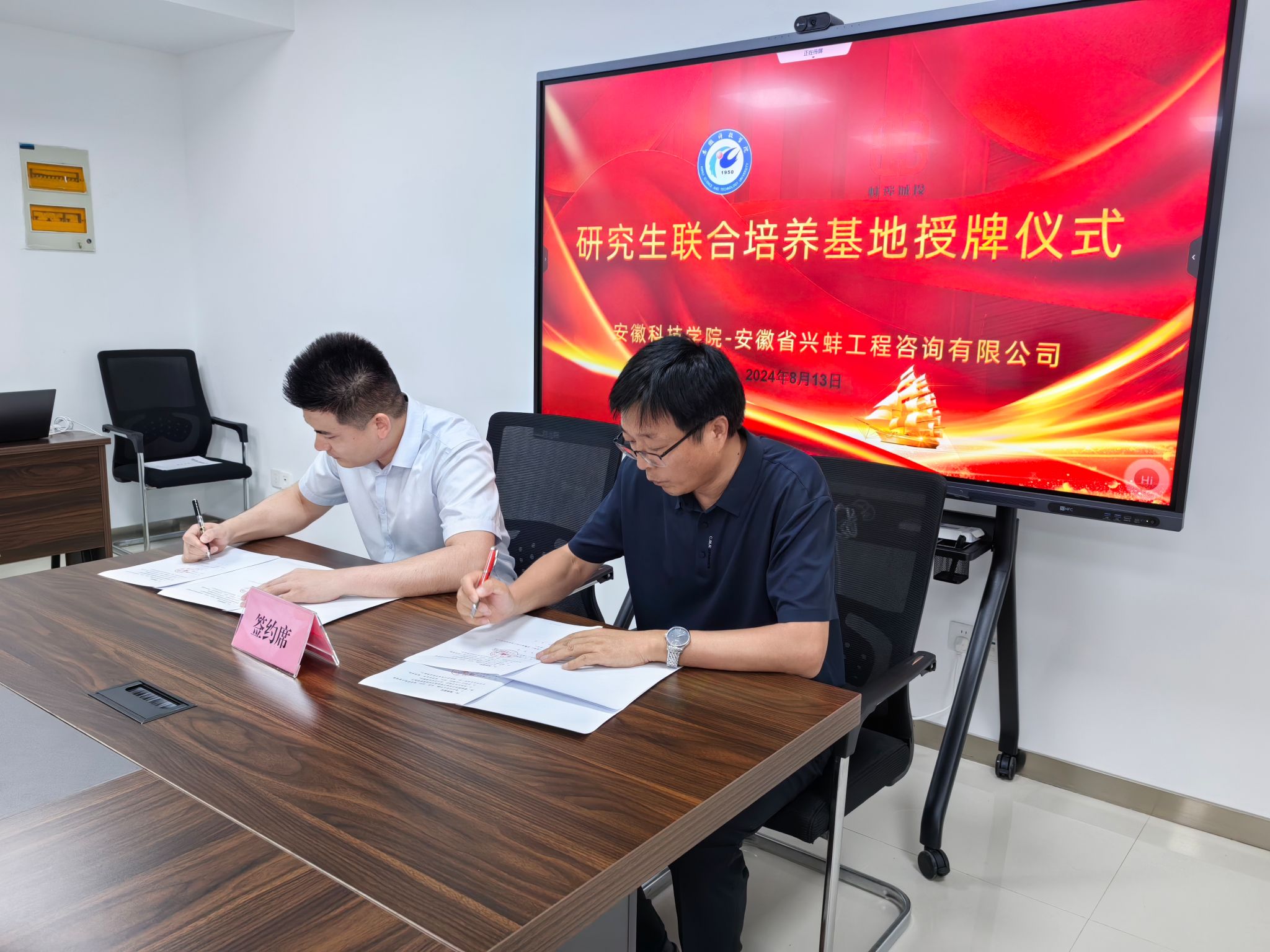 会上,双方举行了“财神在线登录官网共建研究生联合培养基地”授牌仪式,并共同签订了《财神在线登录官网与安徽省兴蚌工程咨询有限公司校企合作协议书》。(特约通讯员:李永鹏 摄影:李永鹏 审核:丁景良)