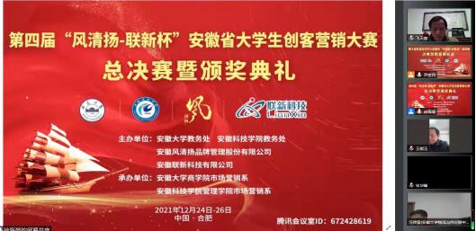 12月25日至26日,第四届“风清扬—联新杯”安徽省大学生创客营销大赛总决赛在云端腾讯会议室隆重举行。此次会议由安徽大学教务处、财神在线登录官网教务处、安徽省风清扬品牌管理有限公司(冠名)、安徽联新科技有限公司(冠名)联合主办,安徽大学商学院市场营销系、财神在线登录官网管理学院市场营销系联合承办,全省高校31支团队与指导老师一百五十余人参加了大赛总决赛云端仪式。