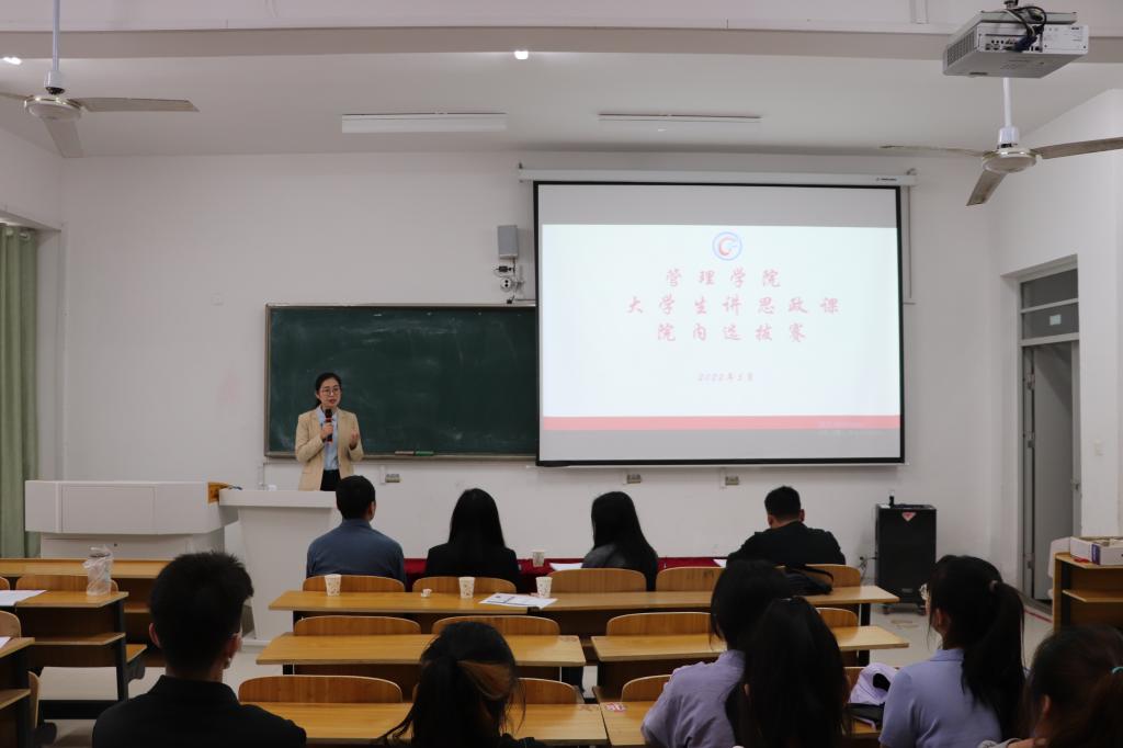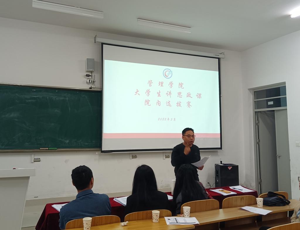 为深入贯彻落实习近平总书记关于深化思政课改革创新的重要指示精神,发挥思政课立德树人关键作用。5月15日下午,管理学院在致知楼B208举办以“青春献礼二十大 强国有我新征程”为主题的大学生讲思政课比赛。马克思主义学院思政课教师赵仁青、黄钦海,管理学院教师武士文、陈凤、李喻受邀担任比赛评委。管理学院副院长张国宝、团委副书记江旭聪到场观看比赛活动。