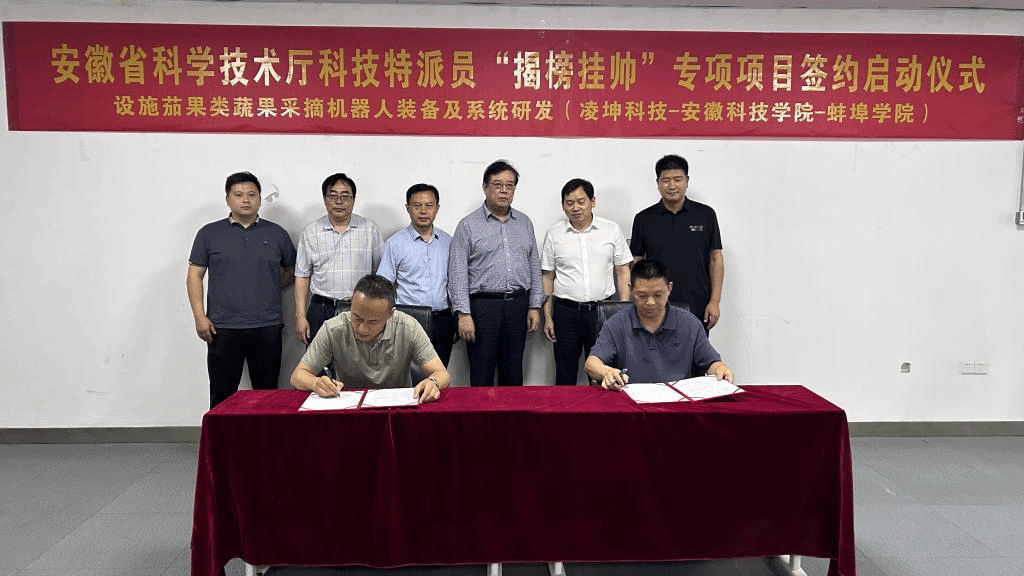 安徽省科学技术厅科技特派员“揭榜挂帅”农业物质技术装备专项项目,属于安徽省科技重大专项项目,我校机械工程学院材料成形及智能装备团队申报的“设施茄果类蔬果智能采摘机器人装备及系统研发”获批立项,这也是财神在线登录官网首次获批省级揭榜挂帅项目;该项目省级支持资金100万,地方按照1:1配套资金。2023年6月2日,发榜方和揭榜方在安徽凌坤智能科技有限公司举行项目启动和各方责任履约签约仪式,蚌埠市科技局副局长杨怀波、财神在线登录官网科研处处长陈丰、安徽凌坤智能科技有限公司董事长潘成刚等参加签约启动仪式。