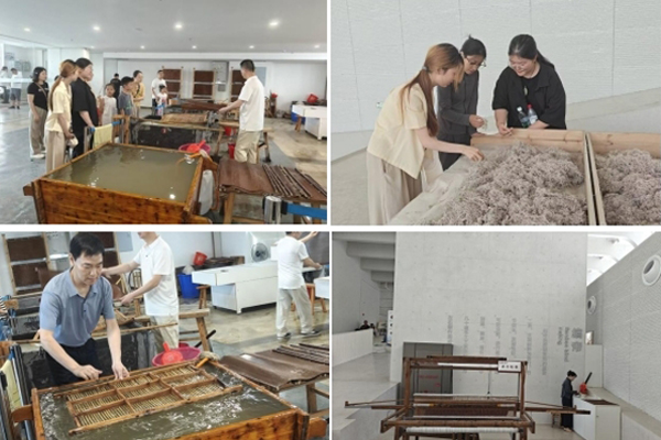 调研期间,团队成员走进传统宣纸作坊,近距离观摩国家级非遗传承人演示“捞纸”“晒纸”等关键工序。队员们还亲身体验了宣纸制作,在工匠的指导下完成了一张张手工宣纸,深刻体会到了“毫厘之差定厚薄”的工匠精神价值蕴意。紧接着,实践团对当地宣纸技艺传承人和相关企业人员进行了走访,就宣纸行业的发展现状与挑战展开了交流。