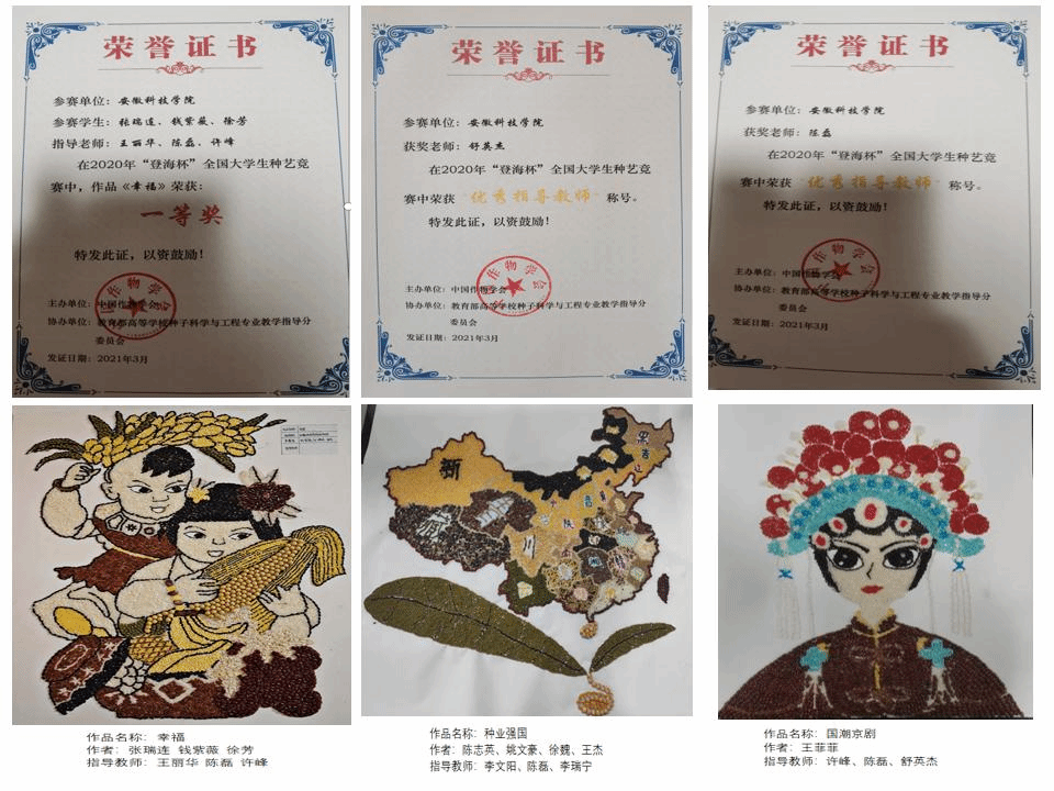 本次大赛的主题是“聚合发展向心力,共筑种业强国梦”,旨在培养大学生“学农、爱农、知农”的三农情怀和探索自然奥秘的创新能力,要求参赛者以种子为素材,以“种业强国”为主题,自拟作品题目,充分发挥专业优势和创造力,制作种艺画、种艺LOGO或种艺创作小视频。组委会共收到来自全国41高校的637件作品,经过复赛和决赛,150件种艺件作品突围,其中特等奖1名、一等奖6名、二等奖7名、三等奖61名、优胜奖75名。我校提交的种艺画《希望》荣获大赛一等奖,《种业强国》《芒种》《国潮京剧》《太空孕育结晶》四件种艺画获三等奖,舒英杰老师和陈磊老师获“优秀指导教师”称号。