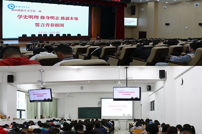 10月10日下午,校党委书记蒋德勤为全体2021级新生讲授“开学第一课”——《学史明理 修身明志 练就本领 誓言青春报国》。授课由校党委学工部部长、学生处处长何永勇主持。