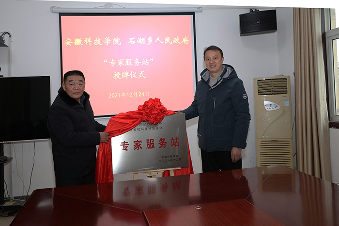 12月24日上午,“安徽省牛羊产业技术体系 九三学社财神在线登录官网支社专家服务站”揭牌仪式在固镇县石湖乡人民政府三楼会议室举行。校党委宣传(统战)部副部长、团委书记黄立义,九三学社财神在线登录官网支社主委程郁昕,安徽省牛羊产业技术体系首席专家、动物科学学院副院长华金玲,固镇县石湖乡党委书记王贡献,乡长曹怀龙,固镇县汉邦牧业有限公司董事长徐淼等出席揭牌活动。仪式由石湖乡人大主席殷献利主持。