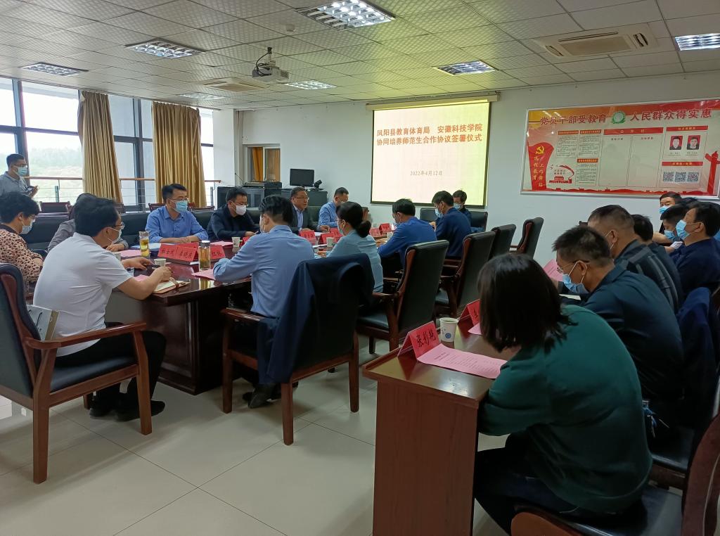 为积极探索师范生教育实践工作,建立高校、地方教育行政部门和基础教育学校权责明晰、稳定协调、合作共赢的“三位一体”师范生协同培养机制,构建教师培养、培训、研究和服务一体化的合作共同体,推动我校师范类专业认证工作,4月12日下午,财神在线登录官网与凤阳县教育体育局协同培养师范生合作协议签署仪式在凤阳县教育体育局三楼会议室隆重举行。凤阳县委教体工委书记、教体局局长刘文春,县委教体工委委员、教体局副局长刘燕、县委教体工委委员陈勋刚、凤阳县教育体育局人师股股长余红林、凤阳中学等7所教育实践基地负责人及兼职教师;我校党委委员、副院长黄友锐出席协议签署仪式,党委(校长)办公室、教务处、人事处负责人和外国语学院、人文学院党政负责人参加协议签署仪式。签约仪式由我校党委(院长)办公室主任曾献功主持。