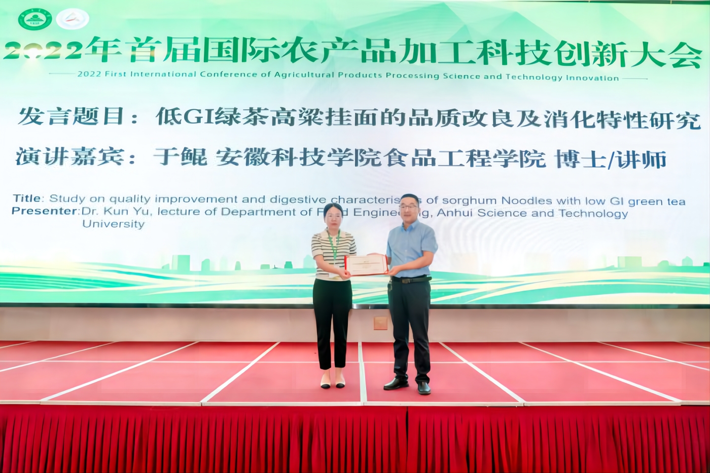 本次大会邀请的朱蓓薇院士、谢明勇院士、熊幼翎教授、金征宇教授、涂宗财教授和宛晓春教授分别做了题为《中式预制菜肴产业的传承与创新》《植物基乳酸菌发酵食品研发与产业化》《植物基肉替代品的市场趋势和技术创新》《特医食品及低GI淀粉基食品配料开发》《新型功能型鱼蛋白胶制备及其精深加工技术研究》和《黄大茶加工技术创新与营养健康》的大会主题报告。杜传来教授作为主持人主持了食品质量安全与检测分论坛。我院三位青年教师陈春旭副教授、卫兰兰博士和于鲲博士应邀分别做了题为《唾液酸化IgG调节肠道菌群缓解IBD效应及机制研究》《功能性复合纳米纤维在食品安全检测及保鲜中的应用研究》和《低GI绿茶高粱挂面的品质改良及消化特性研究》的报告,三位老师的报告引起参会代表的热烈反响和广泛关注,并获得了由大会组委会颁发的优秀论坛报告证书。