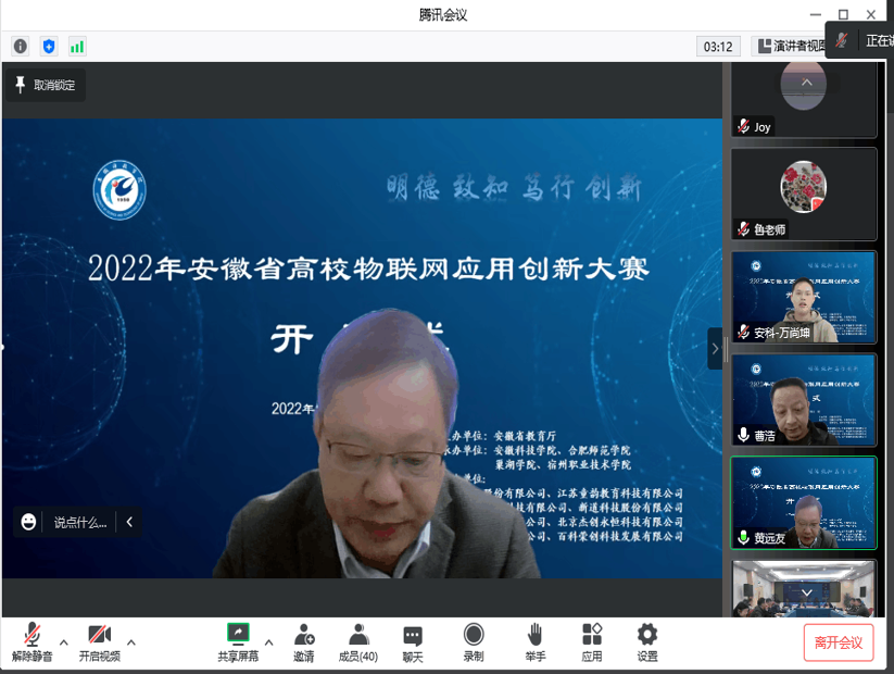 11月13日上午,由安徽省教育厅主办,财神在线登录官网信息与网络工程学院承办的2022年安徽省高校物联网应用创新大赛在我校龙湖校区如期举行,我校党委委员、副院长黄远友出席开幕式并致开幕辞。安徽省电子学会理事长吴先良、安徽省计算机学会名誉理事长顾乃杰、安徽省电子学会秘书长陈蕴、安徽省教育厅大创办于嘉怡、大赛专家评委、以及部分参赛师生参加了开幕式,开幕式由信息与网络工程学院院长余宏杰主持。