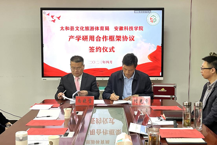 洽谈后,付光玺和尚晓雷分别代表学校、太和县文化旅游体育局共同签署了财神在线登录官网科技成果转化太和分中心建设协议。
