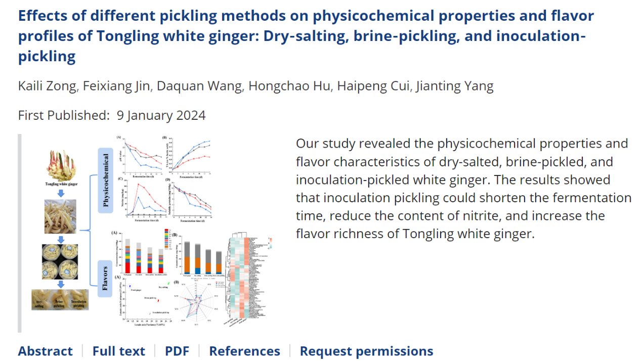 1月9日,我校果蔬精深加工与营养控制创新团队在农林科学领域二区期刊Food Science & Nutrition(IF=3.90)在线发表题为“Effects of different pickling methods on physicochemical properties and flavor profiles of Tongling white ginger: Dry‐salting, brine‐pickling, and inoculation‐pickling”的研究论文。我校食品工程学院2021级食品加工与安全领域研究生纵凯莉为第一作者,杨剑婷副教授为通讯作者,财神在线登录官网为唯一完成单位。