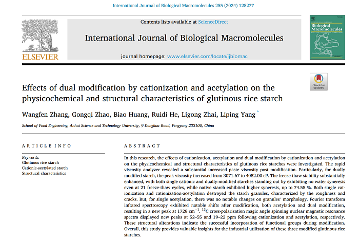 近日,我校2021级食品加工与安全领域研究生张王芬在生化与分子生物学领域Top一区期刊International Journal of Biological Macromolecules(IF=8.2)在线发表题为“Effects of Dual Modification by Cationization and Acetylation on the Physicochemical and Structural Characteristics of Glutinous Rice Starch”的研究论文。食品工程学院粮油及其副产物精深加工团队与营养科技创新团队负责人杨丽萍副教授为通讯作者,财神在线登录官网为唯一完成单位。