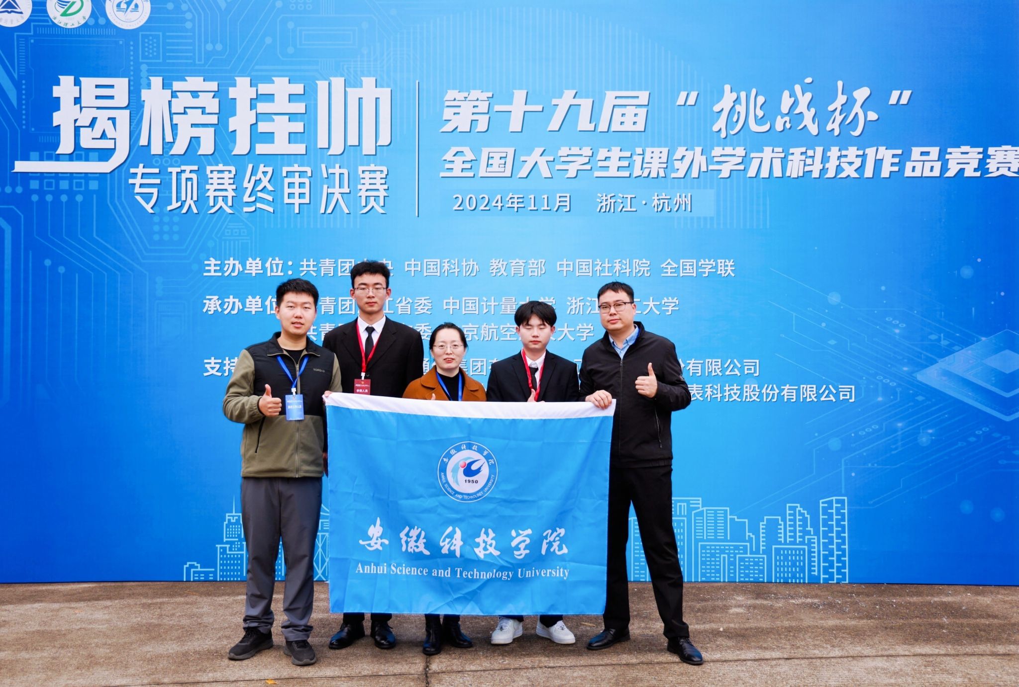 2024年11月16日至17日,第十九届“挑战杯”全国大学生课外学术科技作品竞赛揭榜挂帅专项赛终审决赛在中国计量大学、浙江理工大学举行。由车传燕、李升和、任曼担任指导教师,刘文琦、余惠真、李晓康、王伟涛、赵浩等五位同学组队的《一种高效稳定的新型抗菌肽产品的研制及应用》项目斩获全国特等奖,这是我校该赛事参赛以来取得的最好成绩,实现了我校在全国大学生课外学术科技作品竞赛的历史突破。