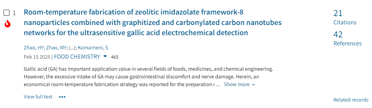 近日,Essential Science Indicators(ESI)公布最新统计数据,我校化学与材料工程学院化工新材料科技创新团队在国际顶级学术期刊《Food Chemistry》(中国科学院农林科学大类一区,应用化学小类一区)发表的研究论文《Room-temperature fabrication of zeolitic imidazolate framework-8 nanoparticles combined with graphitized and carbonylated carbon nanotubes networks for the ultrasensitive gallic acid electrochemical detection》入选ESI全球TOP0.1%热点论文。