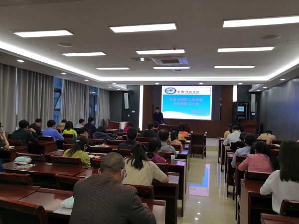 5月13日下午,信息与网络工程学院在西辅楼111会议室召开全体教职工会议。信息与网络工程学院副院长余宏杰、副处级辅导员韦乃学及全体教职工参加会议。会议由余宏杰主持。
