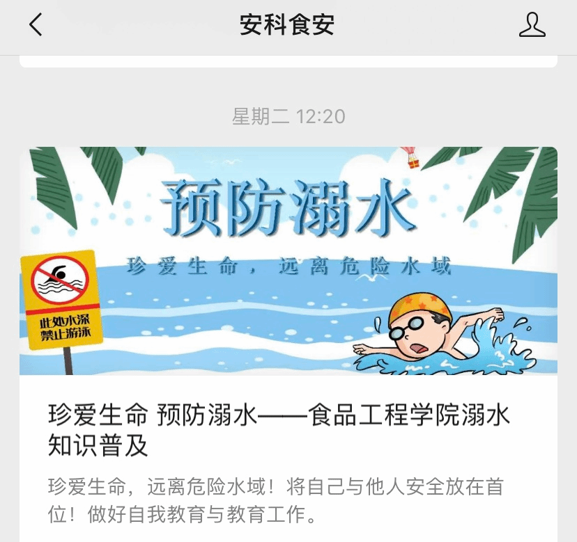 食品工程学院学生会网宣部、易班工作站,分别以微信公众号、易班为主阵地,围绕预防溺水、溺水科普、溺水救助等方面进行了一系列宣传,发布了“珍爱生命,预防溺水——食品工程学院防溺水知识普及”等话题。