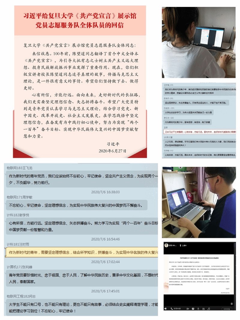 习近平总书记的回信字里行间对青年的殷切期望和谆谆嘱托让广大师生倍感振奋,深受鼓舞,纷纷展开热烈讨论。信息与计算科学171班贾梦梦说:“学习了习近平总书记给复旦大学青年师生党员的回信后,我倍受鼓舞,同时也更加明确了自己肩上的责任与担当,更加坚定了实现中国梦的决心与信心。作为一名大三学生,同时是一名预备党员,我更应该不断努力丰富马克思主义理论知识储备,完善自己的专业知识,提高自身能力,开拓进取,奋发拼搏,为实现伟大的中国梦贡献出自己的智慧与力量”。物联网工程181班郑洁说:“只有坚定自己的理想与信念,青年的我们才能在实现中国梦的道路上越走越远。以后的学习、生活中努力用坚守和奉献诠释责任与担当,不负青春韶华,为实现中华民族伟大复兴而贡献自己的青春力量。”网络工程192班张酉:“在习近平总书记给复旦大学《中国共产党》展示馆党员志愿服务队全体队员回信中教导的奋发有为,积极向上,言语间使我了解到要持之以恒的做好我们自己的事,牢记总书记的嘱咐,用自己的力量,强大我们的祖国。”