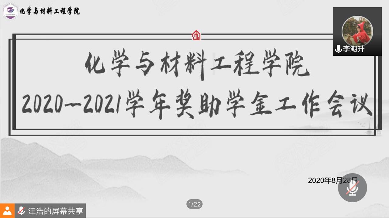 8月28日下午,化学与材料工程学院通过腾讯会议召开奖助学金工作培训会议。会议由学院分团委副书记许妮、辅导员李潮升和各级班长、团支书、学习委员、资助委员参与会议。