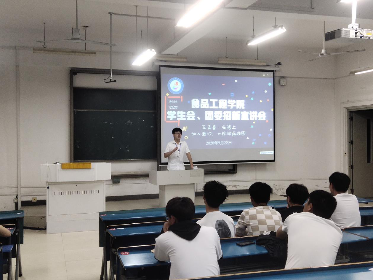 随着新学期的开始,食品工程学院又迎来了一批青春洋溢的萌新。为了让新生们在学习之余也能锻炼个人综合能力,更为了团委、学生会工作更好的展开,同时保证团委、学生会不断有新鲜血液注入。 9月22日,食品工程学院团委、学生会面向2020级新生举办了招新宣讲会。出席本次招新宣讲会的有食品工程学院学院团委、学生会各部门负责人以及2020级全体新生。