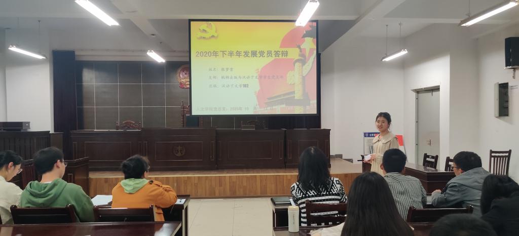 10月14日下午,人文学院在模拟法庭举办2020年下半年发展党员答辩会,学院党总支秘书、分团委书记李沙娜,辅导员曹珊珊、焦雪松、王其,编辑171党员徐帅、法学172党员梁雨鑫和汉语言卓越171预备党员高晓丹担任评委。26名党员发展对象候选人参加答辩会。
