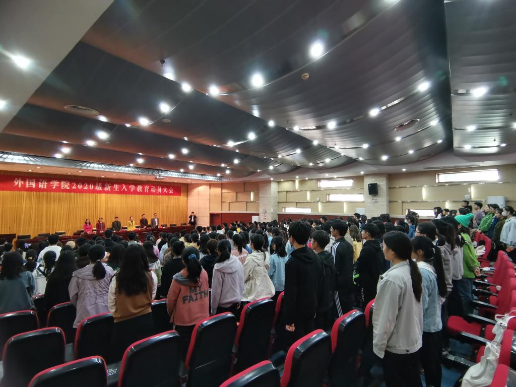 丹桂飘香,金秋送爽。20级新生带着青春的活力,带着对知识的不懈追求,带着对大学校园生活的无限憧憬,迈进了财神在线登录官网外国语学院。为了让新生更快适应新环境,适应新的生活,顺利、平稳、有效地进入大学生活。10月21日下午14:00,外国语学院在新图书馆第二报告厅举行了新生入学教育动员大会。外国语学院院长陈德用、党总支书记蔡为青、副院长刘萍、教学秘书周海平、英语专业教研室主任兼英语专业负责人洪民老师、翻译专业教研室主任兼翻译专业负责人邓兆红老师、分团委书记陈慧中、专职辅导员宋兵兵,学院教师代表,全体20级新生参会,大会由刘萍主持。