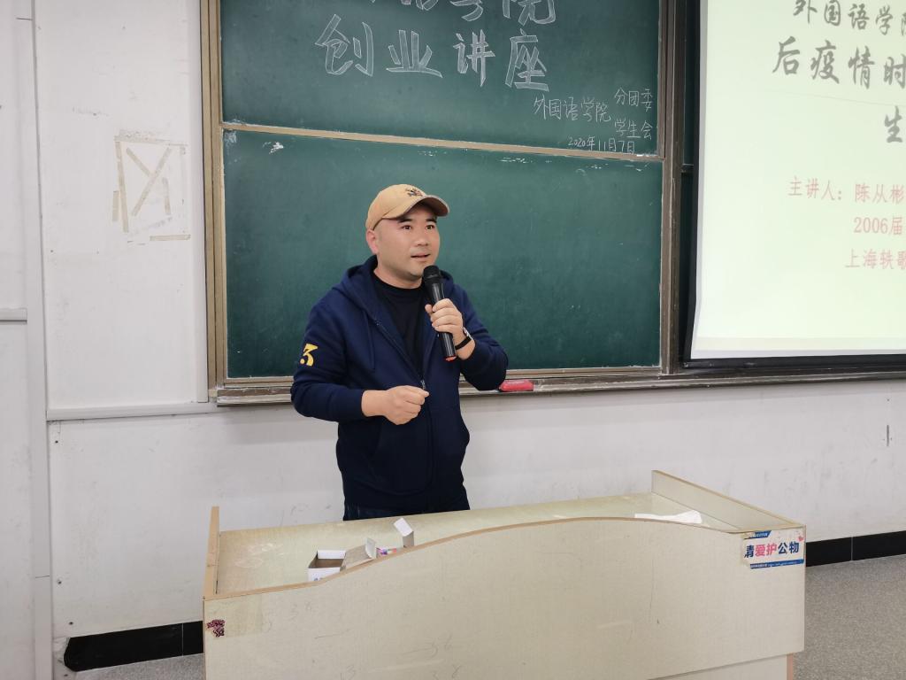 11月7日下午,外国语学院优秀校友创业报告会在求知楼A座205教室举行。本次会议邀请06届英语专业毕业生、上海轶歌实业有限公司董事长陈从彬,06届英语专业毕业生、诺亚财富绍兴分公司总经理梅杰,09届英语专业毕业生、安徽宜人纸塑包装材料有限公司总经理龙超,学院党总支秘书张海亮、分团委书记陈慧中出席, 20级全体新生参加本次讲座。