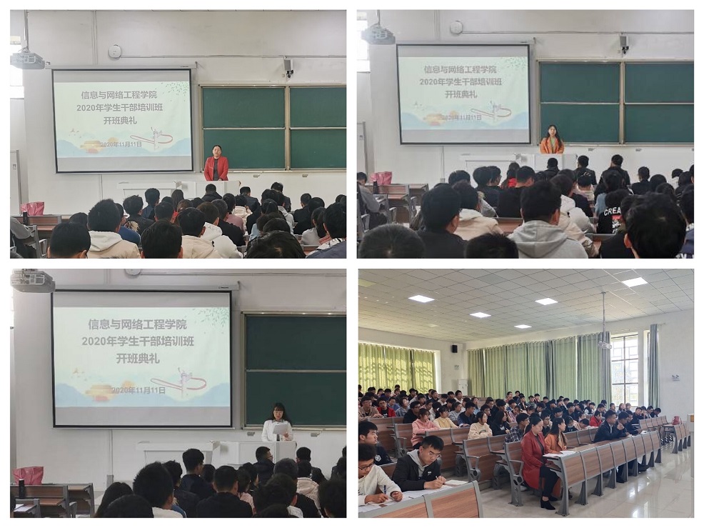 为提高学生干部综合素质,引导学生干部健康成长,更好地发挥学生干部的桥梁纽带作用。11月11日中午,信息与网络工程学院于致知楼A111举办2020年学生干部培训班开班典礼。学院副处级辅导员韦乃学,党总支秘书杨晓宁,专职辅导员王培培、陈凯、李军成、崔北坤出席开班典礼。2020级全体班级学生干部、分团委、学生会、易班工作站、学生心理委员会的新入职同学参加本次开班典礼,典礼由杨晓宁主持。