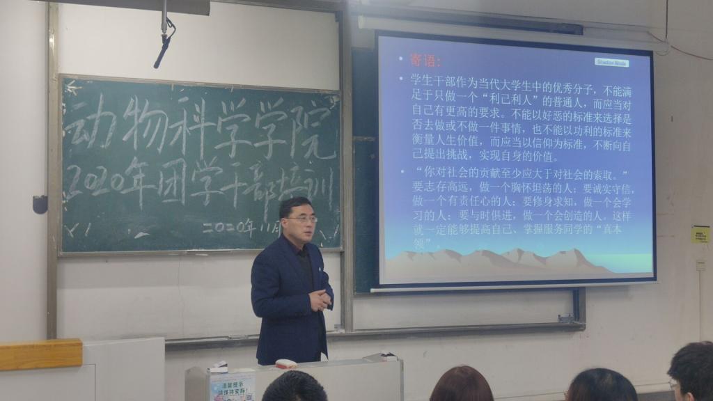 为加强团学干部队伍建设,提高团学干部的政治素质、工作水平和实践能力,11月25日下午,动物科学学院于新知楼a110举办2020年团学干部培训班之“内化于心,外化于行”专场报告会,动物科学学院党总支书记姚勇、分团委书记李焱出席会议。18-19级各班班长、团支书及团委、学生会各部门负责人参加会议,本次培训会由姚勇主讲。