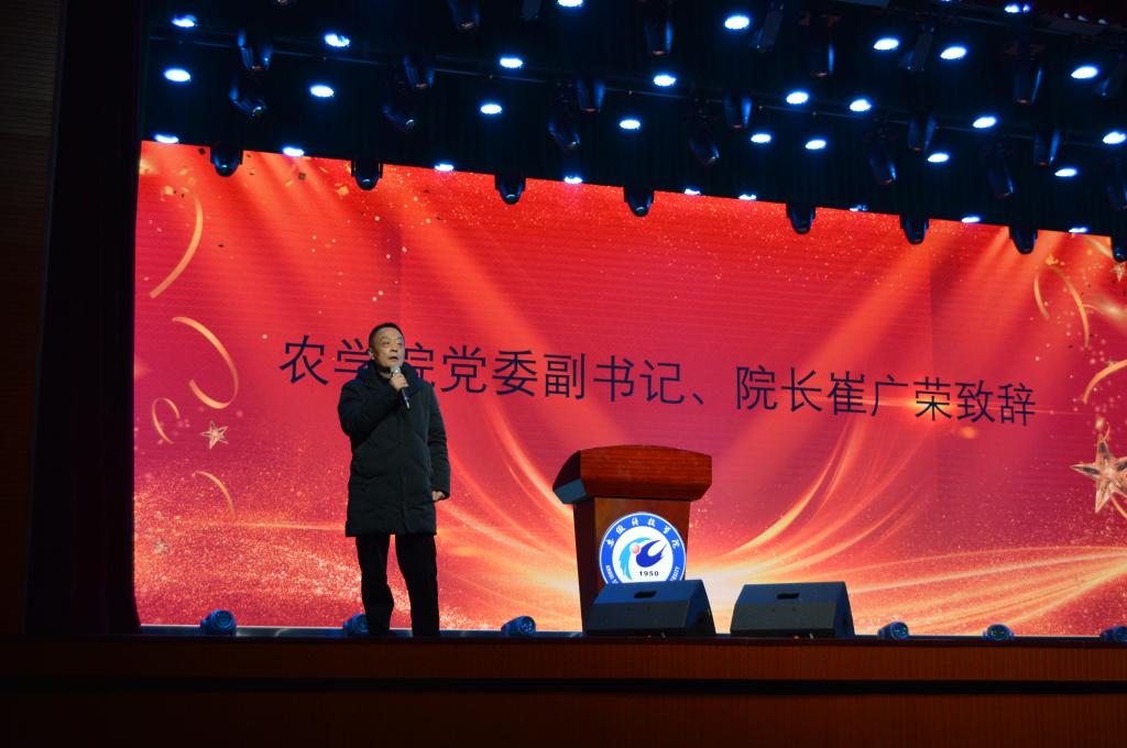 晚会正式开始前,何世潮主持开幕式并致辞,他寄语新生,对加入农学院的338名新生表示热烈欢迎。优秀校友郭凯向同学们分享了三个话题:大学生活是什么、大学学什么以及农学院毕业生将来的意义。崔广荣用慷慨激昂的话语鼓励新生在新的环境中、在农学院雄厚的师资力量支持下立志“三农”,努力学习,做一个优秀的“一懂两爱”的农科人才。