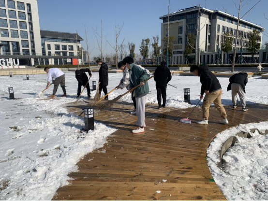 一场大雪让校园美轮美奂,但冻结的路面也成为校园安全的隐患。为了让师生们在综合信息楼南广场安全行走,铲雪队员们用铁锹在前面铲雪,扫雪队员们则在后面用扫帚清理,配合默契。寒冷的天气丝毫不影响同学们的劳动热情,经过一个多小时的劳碌,清晰鲜亮的实木路面从雪里露了出来,花坛与道路的积雪全部清除。除雪队员们干劲十足,更是主动将敏行楼A、B座走廊的湿滑的冰面也清除干净,彻底消除了安全隐患。