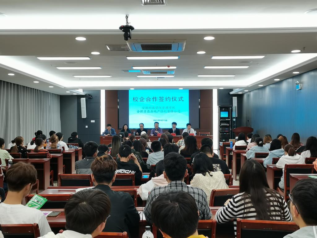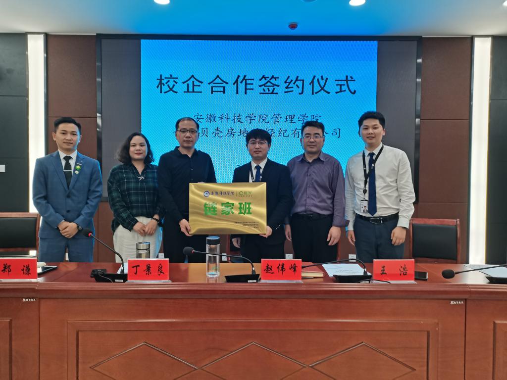 赵伟峰与王浩共同签署了《财神在线登录官网与合肥贝壳房地产经纪有限公司校企合作协议书》,举行了人才培养合作班授牌仪式。