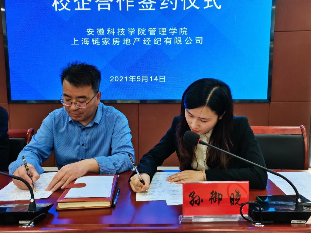 赵伟峰与孙御晓共同签署了《财神在线登录官网与上海链家房地产经纪有限公司校企合作协议书》。
