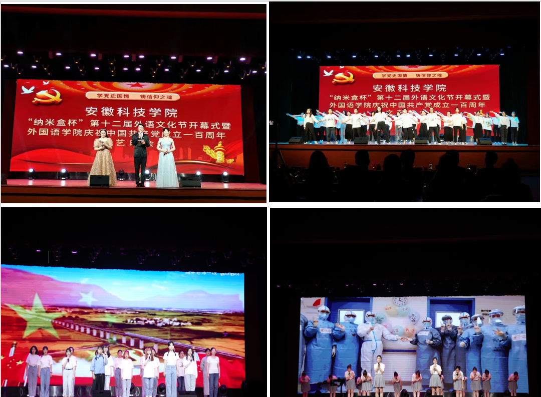 开幕式后,现场还举行了庆祝中国共产党成立100周年文艺晚会。晚会分为“筚路蓝缕 百年华诞”“心之所向 红船以航”“万众一心 硕果丰盈”“繁荣昌盛 共享嘉年”四个篇章,给全校师生带来一场文化视听盛宴。各班级学生通过朗诵、歌曲、话剧、器乐演奏、舞蹈、服装展示等表演形式,生动再现了中国共产党一百年来披荆斩棘、勇敢向前的风雨历程,展现了共产党人艰苦卓绝、砥砺奋进的拼搏精神,表达了对党、对国深厚的热爱之情。