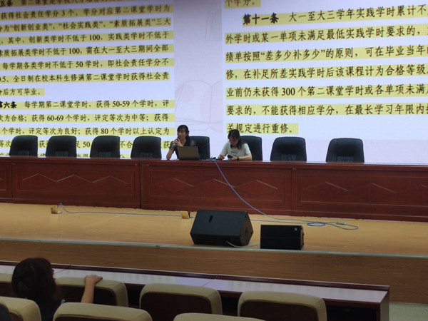 院团委学生委员蔡薇薇对《第二课堂成绩单(社会责任学分认定)实施细则(试行)》文件精神对二课成绩单的认定范围、认定标准等方面进行详细解读,就“第二课堂”管理及学分认定等内容在平台网页端、手机客户端的操作流程进行了演示,现场模拟从活动发起到签到签退、上传新闻稿件等全过程。
