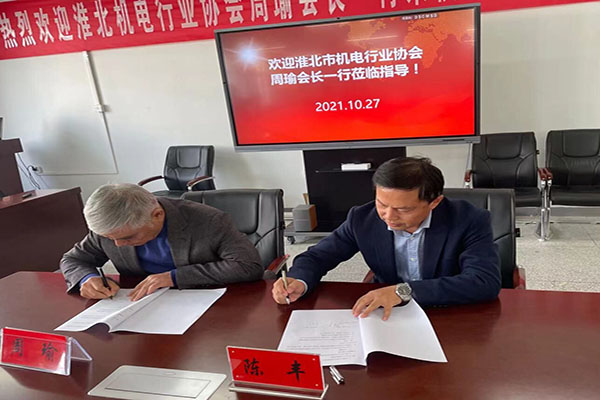 陈丰和周瑜代表双方签订产学研合作协议。陈丰强调,与淮北机电行业协会全面开展战略合作,具有重要而深远的意义,不仅有利于优化学院学科专业结构,提高机械类专业应用型人才培养质量,还有利于进一步我校提升教师业务能力,拓宽社会服务领域,助推地方经济社会发展。陈丰希望校企双方本着互惠共赢、优势互补和协同育人、共同发展的理念,积极打破固有管理体制,不断拓宽合作渠道,在科技合作、资源共享、人才培养等领域无缝对接,努力把产教融合、校企合作做深做实、做出成效,形成共同发展、相互促进、合作共赢的新格局。