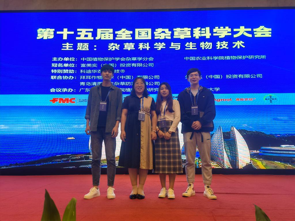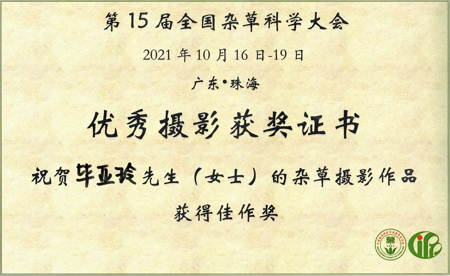 我校农学院植物保护系主任毕亚玲博士带领其团队三名研究生参加了会议。我校2020级农艺与种业领域研究生许孟桃在研究生专场做了《砜吡草唑除草活性及应用技术初步研究》的研究生专场报告,并对现场专家提出的问题进行了对应式回答,其提交的会议论文获得了优秀论文奖。许孟桃的现场报告和理论功底表现突出,受到与会专家的好评。同时,毕亚玲提交的杂草摄影作品《苋之现》荣获优秀摄影作品奖。