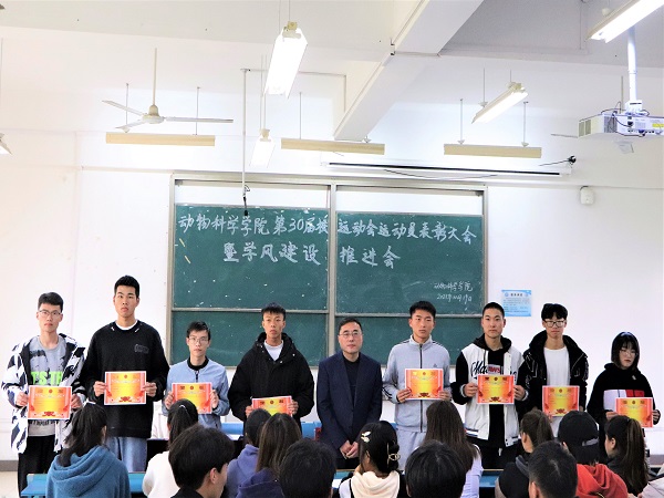11月19日中午,动物科学学院在新B205教室召开校第三十届田径运动会运动员表彰大会暨学风建设推进会。学院党委书记姚勇,党委副书记、纪委书记汤帅,院党政办主任、团委书记李焱,辅导员胡文丽、范雨梦出席会议。全体运动员和学生干部代表参加会议。会议由汤帅主持。