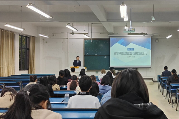 高飞结合自身经历与学生分享了律师的职业规划与执业技巧,法学生的就业选择以及要充分利用大学时期和实习期进行自我提升;他还强调了青年律师应该具备抗压、沟通表达、写作等多方面的能力。