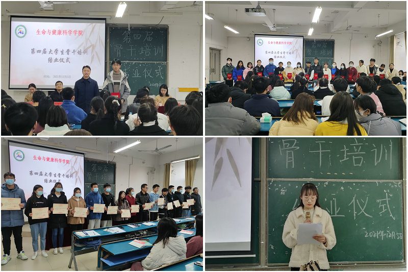 12月5日下午,生命与健康科学学院在新知楼B304教室举行第四届大学生骨干培训班结业仪式。学院党委书记詹学文、党委副书记彭丽萍、党政办公室主任王传林、团委副书记姜毅、专职辅导员孙玉楼及专职辅导员张迪出席仪式,21级各班级班委、学生会21级部分实习生共计170余人参加会议。会议由张迪主持。