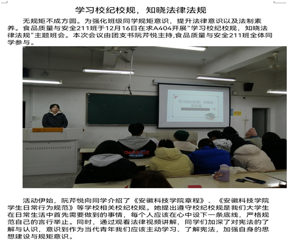 为进一步弘扬社会主义法治精神,增强大学生法治意识,培养法治素养,引导大学生自觉学法、懂法、知法、遵法、用法,近期以来,食品工程学院开展了法治教育系列活动,进一步促进大学生遵纪守法和学院法治氛围的形成。