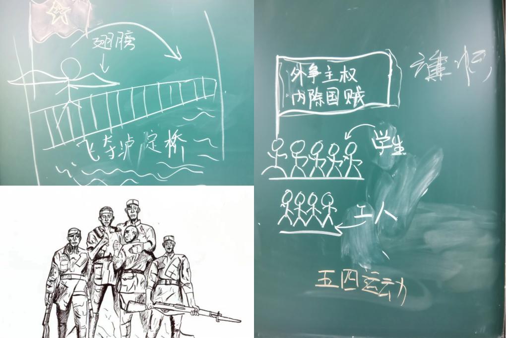 “绘图接龙”环节,同学们以自主、探索、合作为主的方式参与其中。他们齐心协力,结合专业特长,挥动手中的粉笔或画笔,将自己对于团史红色故事的理解呈现在黑板、画纸上。在作图方面,或以故事思维导图形式,或以红色记忆标语形式,重温经典。