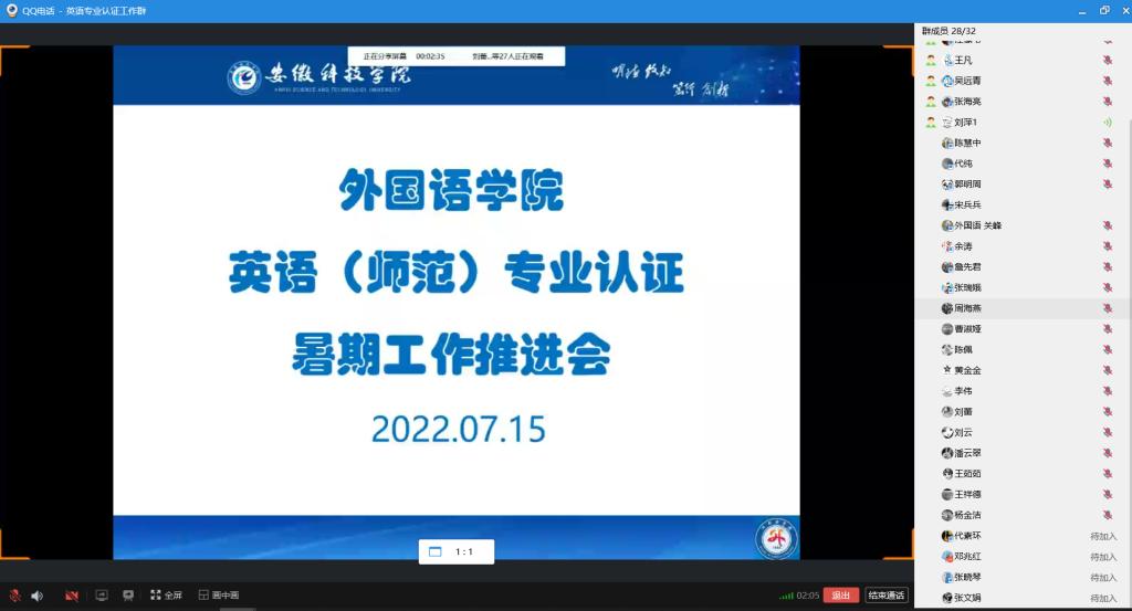 为了推动英语(师范)专业认证工作的顺利进行,7月15日晚8点,外国语学院通过QQ群召开了暑期第一次全员推进会。学院党政领导及专业认证团队全体成员参会,会议由外国语学院院长刘萍主持。